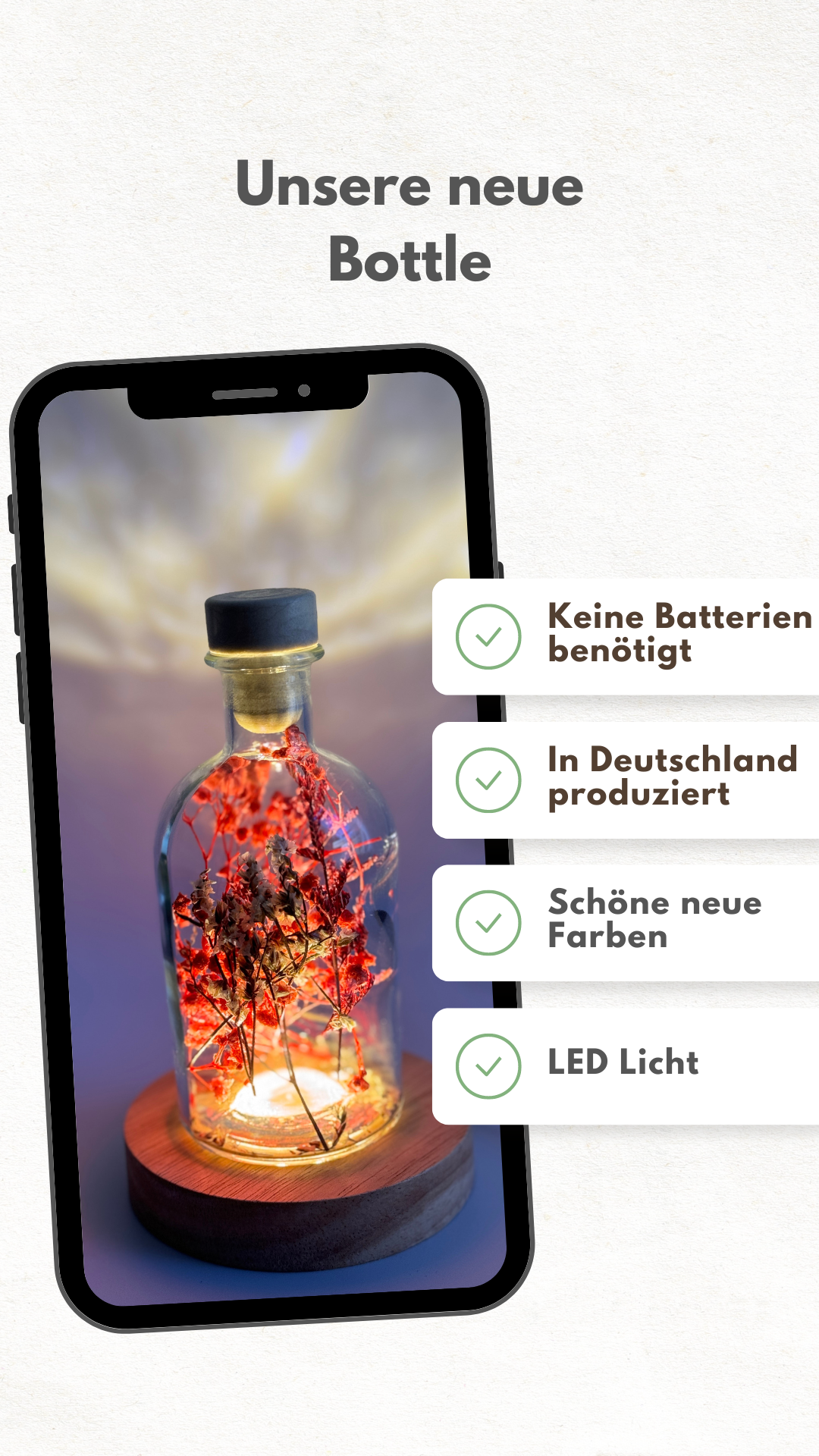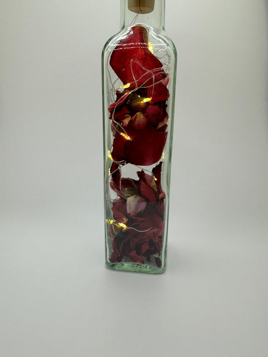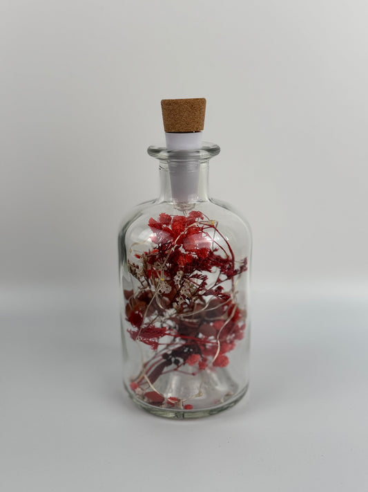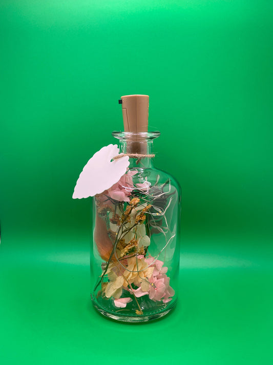 Entdecke die einzigartige Fusion von Natur und Licht mit Flowerbottles. Unsere exquisiten Flaschen, gefüllt mit handverlesenen Trockenblumen und sanft beleuchtet von einer LED Lichterkette, verwandeln jeden Tisch in eine charmante Oase. Genieße die beruhigende Atmosphäre dieser stilvollen Tischlampen, die nicht nur Licht spenden, sondern auch zeitlose Schönheit und natürliche Eleganz in Dein Zuhause bringen.