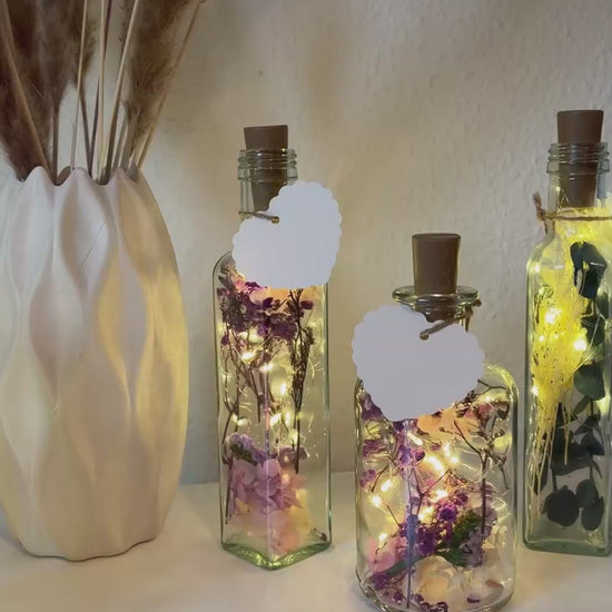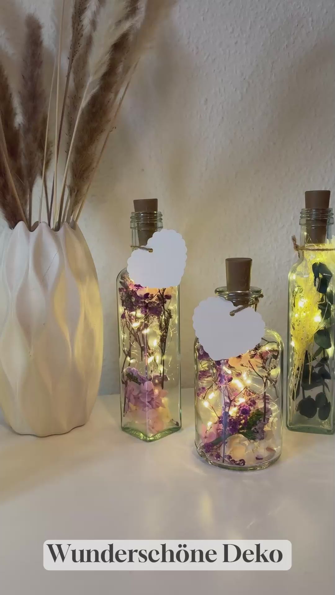 Unsere Flowerbottle verleiht deinen Räumen das gewisse Etwas. Jede Flasche wird von Hand gefertigt und mit sorgfältig ausgewählten Trockenblumen gefüllt. Die Kombination aus sanften Farbtönen und dem warmen Licht der Flaschen schafft eine harmonische Atmosphäre. 🏡💡
